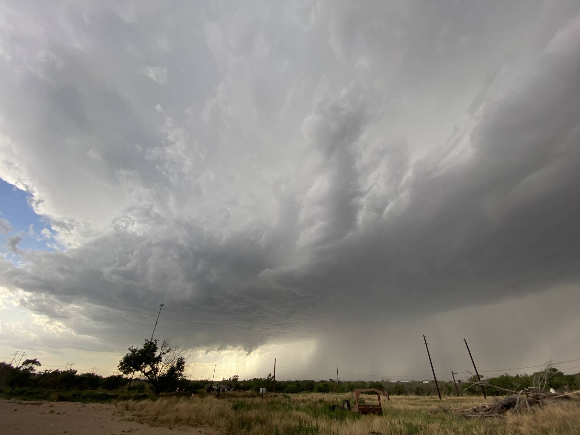 We relocated to the south side of Sundown to an empty lot I’m aware of. It gave us a good view west. So we hung around a little bit. I also had time to put the drone up a little bit more here. I didn’t have long… I got a few pictures and one timelapse. And things happened fast. In only the time it took me to go from landing the drone, packing it back in the case, and stowing it back in the truck… we had a fully fledged wall cloud with some of the more intense horizontal rotation I’ve seen out of a storm in quite some time. If you look closely at the end of the drone timelapse, you’ll see the first bit of RFD hit the ground off in the distance.