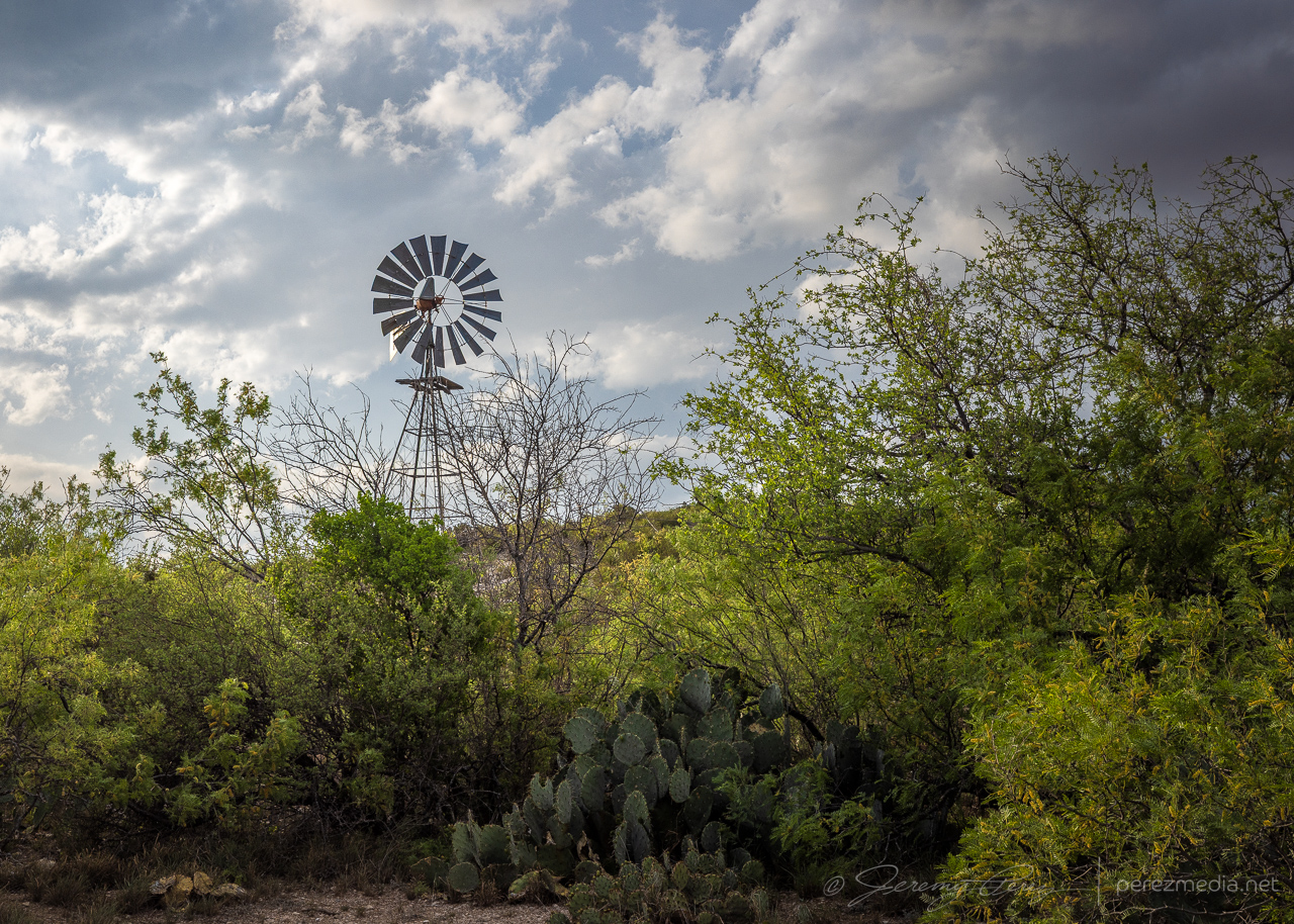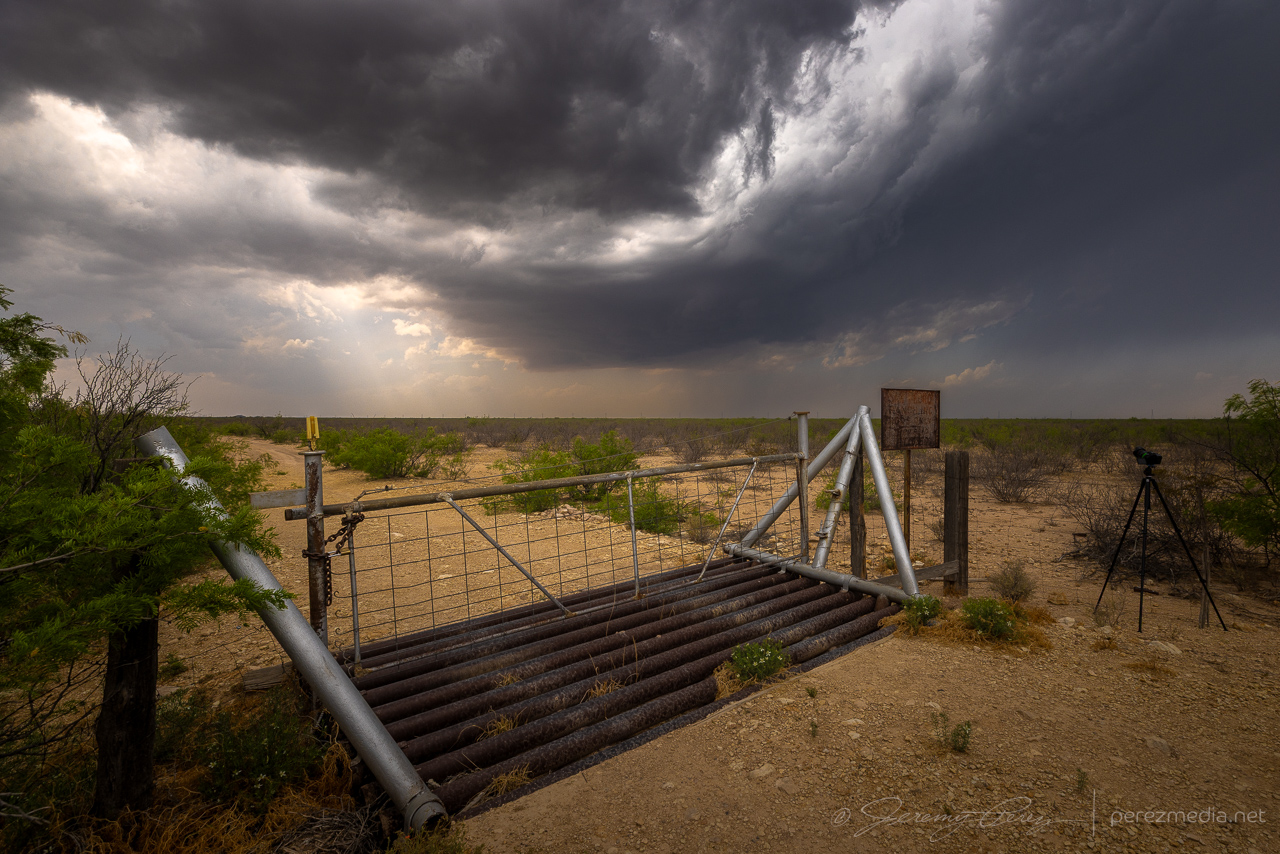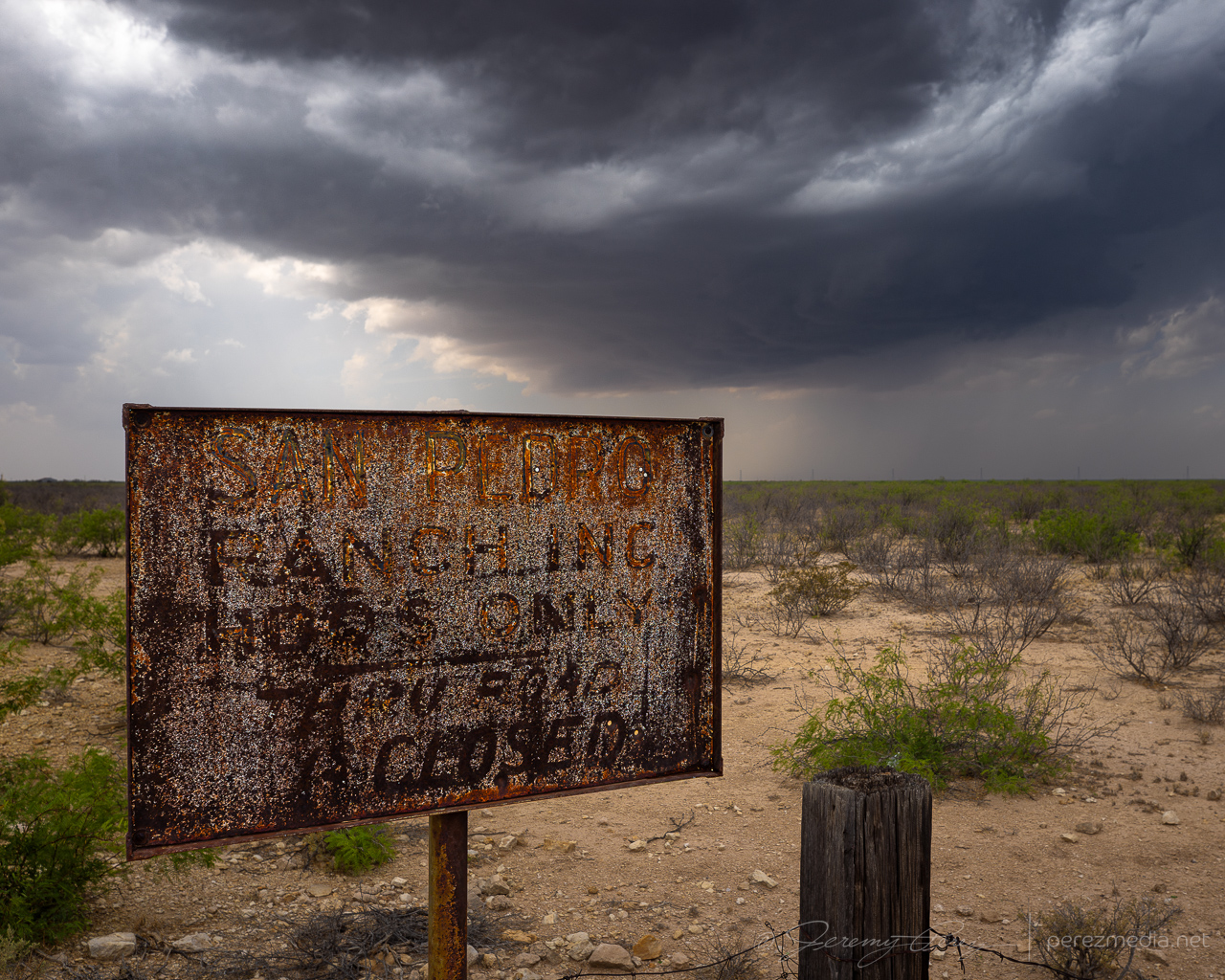 The first cell to strengthen led me north of town for a bit. The quest for foreground interest wasn’t especially productive, but I found a gate with a blistered sign to watch the storm mature.