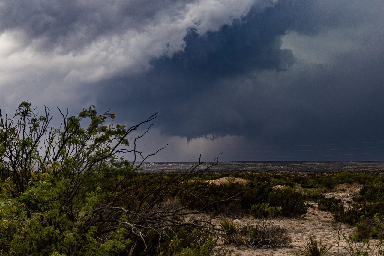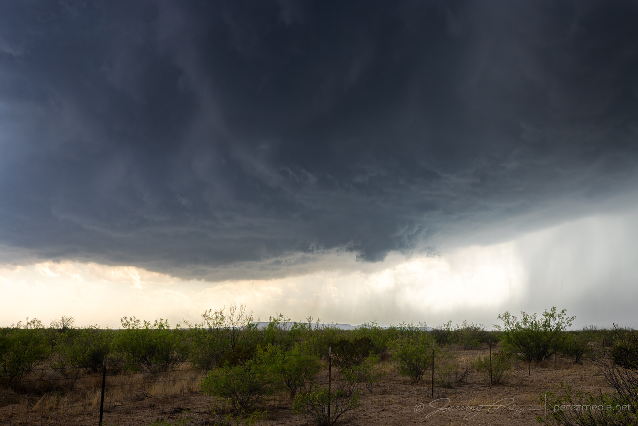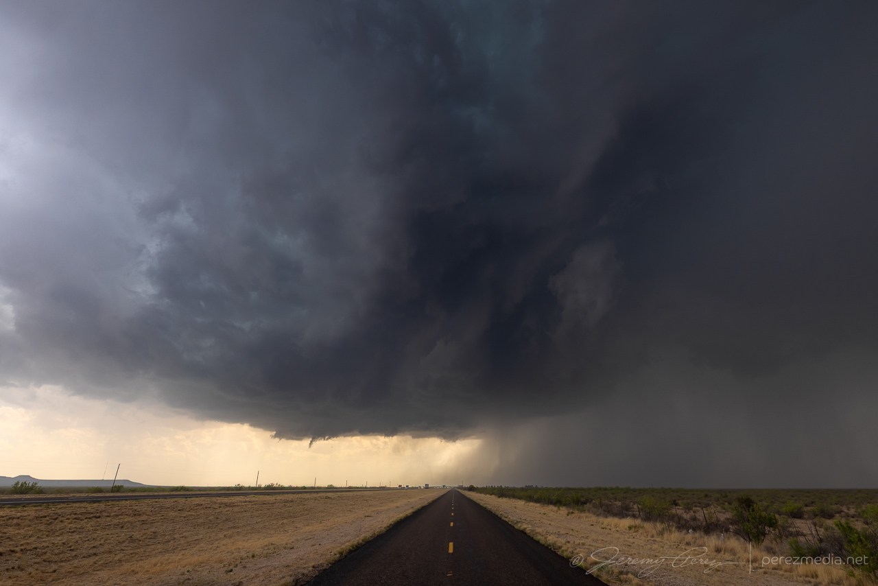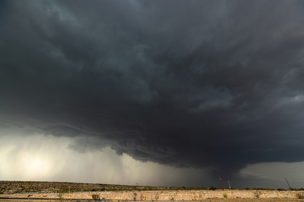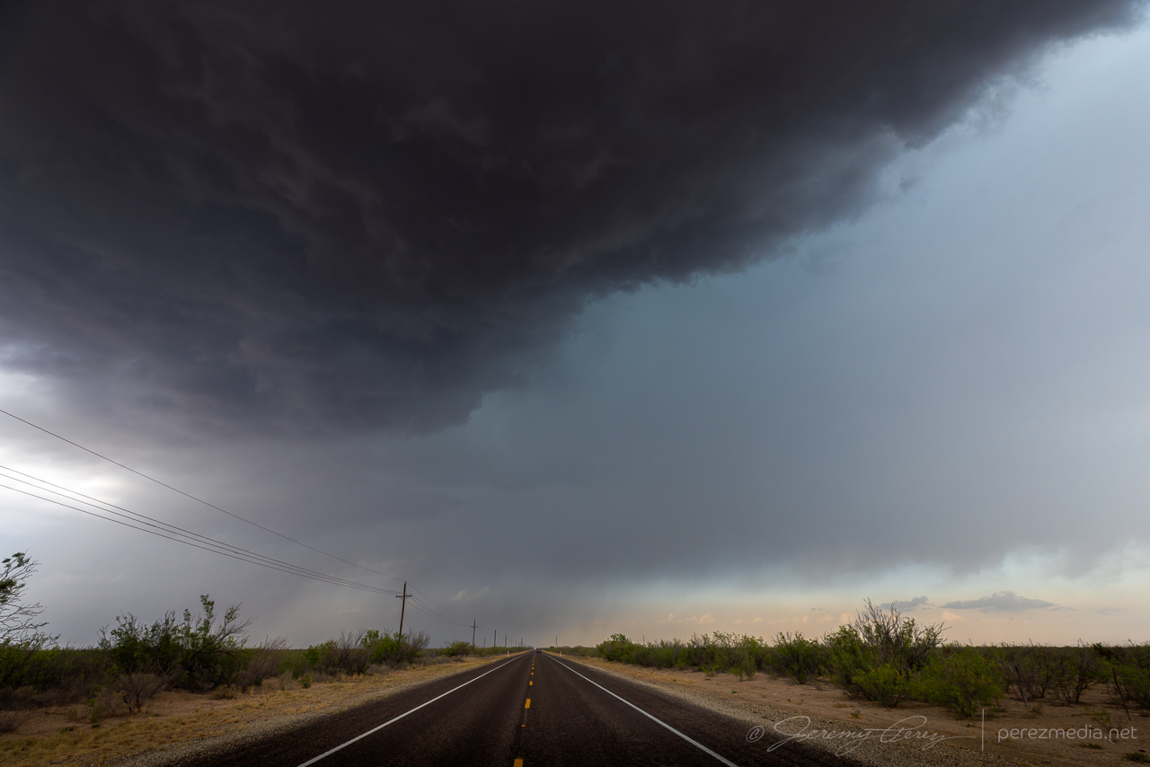 I was hoping the southern cell would drift roughly eastward for a while and plant something similar to the previous two Fort Stockton excursions. I was also interested in being positioned to keep an eye on the northern cell as much as possible. But both cells took a hard turn to the southeast rather quickly without either dropping anything. At this exact turning point, the southern one was perfectly aligned with Highway 285 off to the west, with the core cutting me off from repositioning for an excellent, steady vantage since I had committed east along I-10.