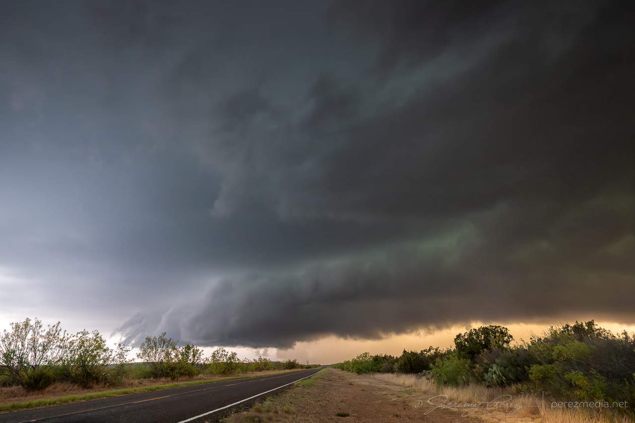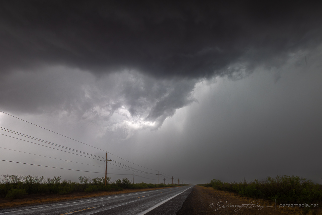 At this point, the storm split, started going elevated and took a more easterly path as it turned grungier. Meanwhile its offspring organized west of the highway. I took off after the original down RM2400 and watched as it crossed the road and continued falling apart.