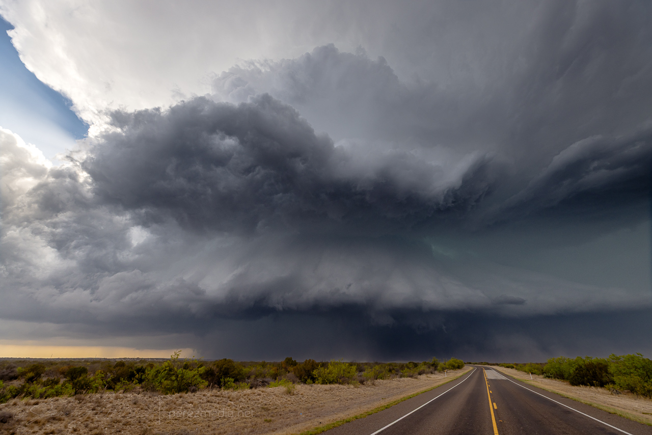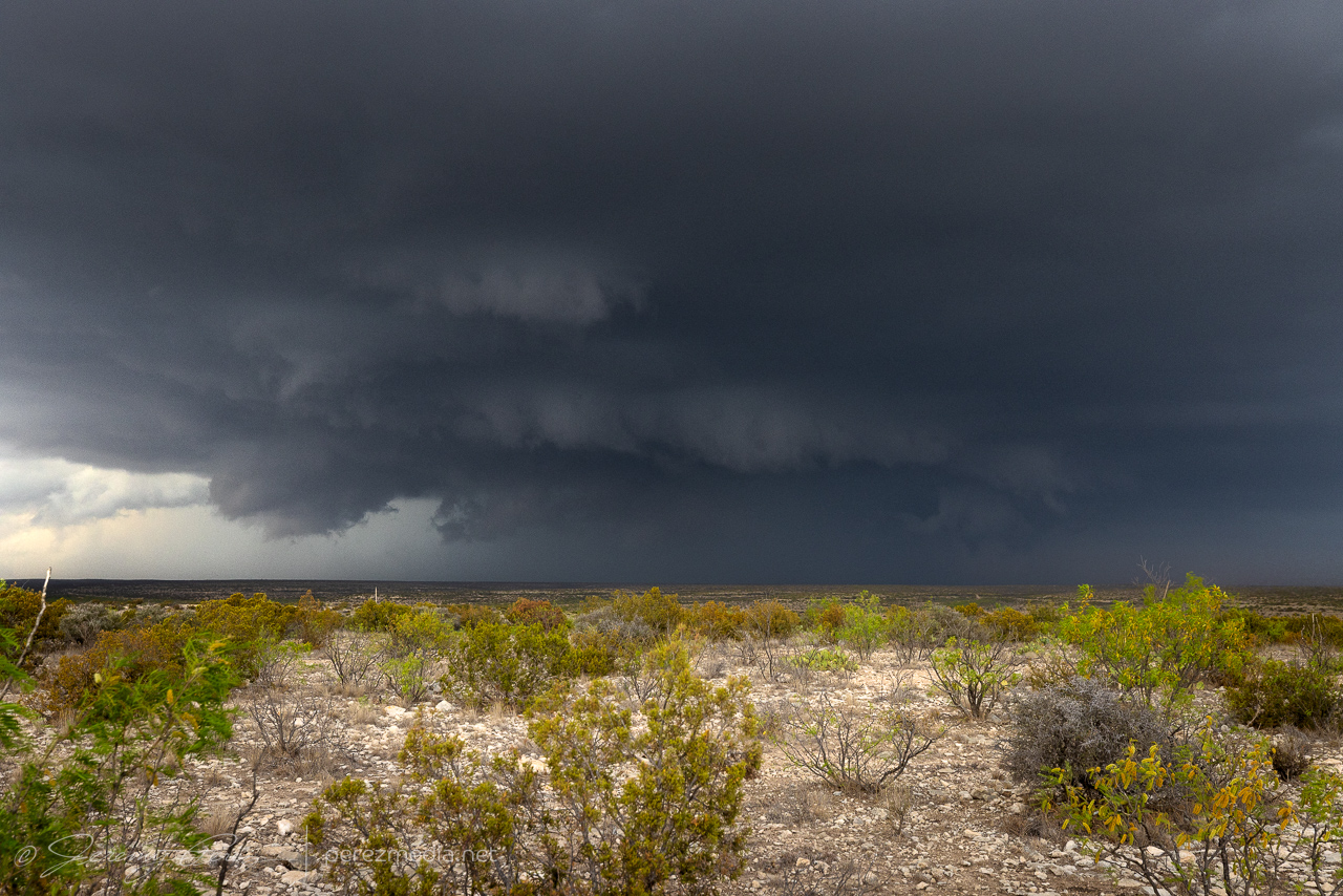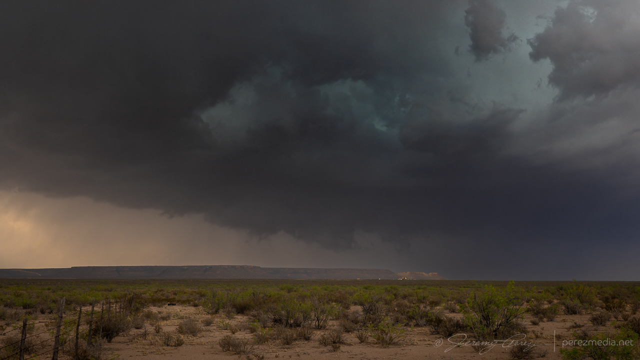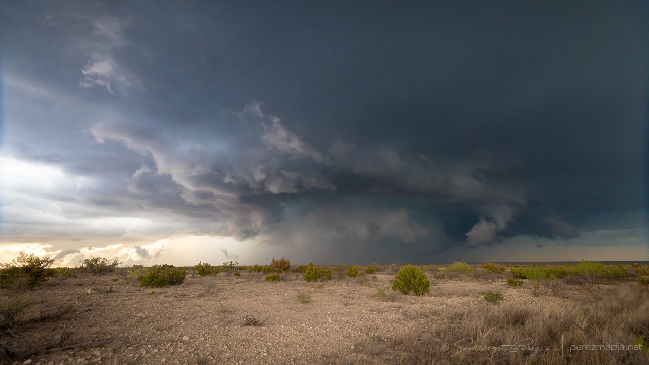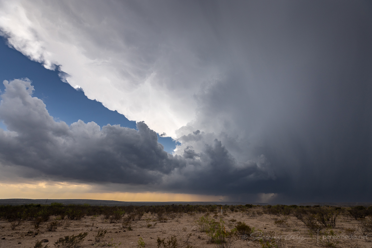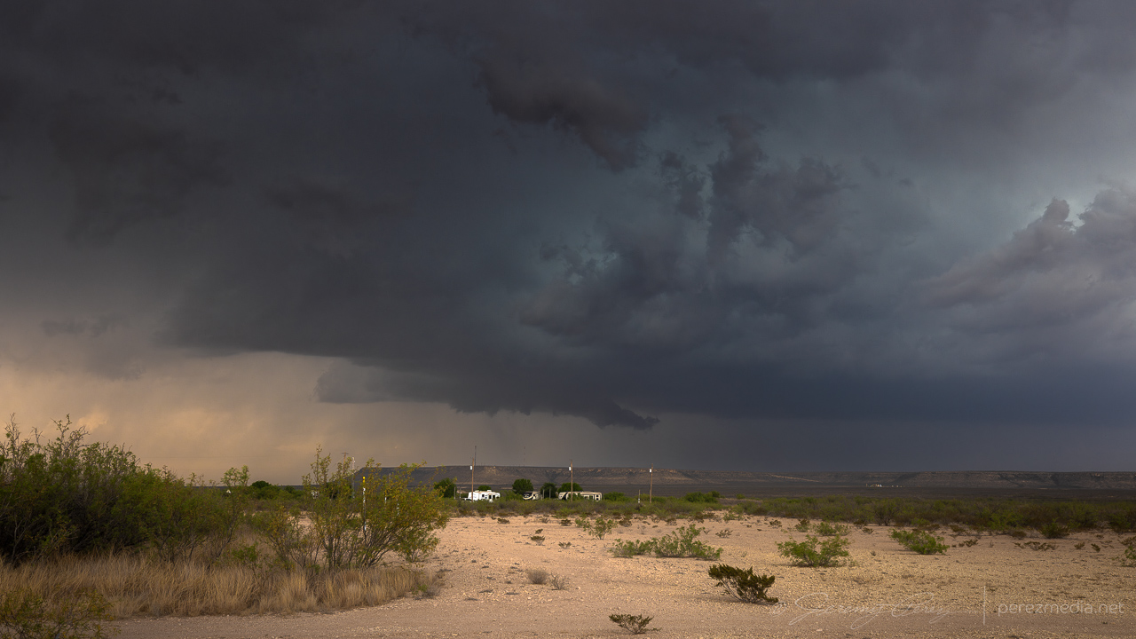 Before it could gather strength, a new cell formed on its southeast flank and took over to my north. At the same time, an even stronger storm was forming to the south, on the west edge of Fort Stockton. As it blew up in size, it rang some pattern recognition bells, so I bailed out and headed to the Interstate to see if we could get a three-peat of 2019 and 2023. Drifting a bit east on I-10, I was able to keep an eye on the northern cell and the newer one looming over the city.