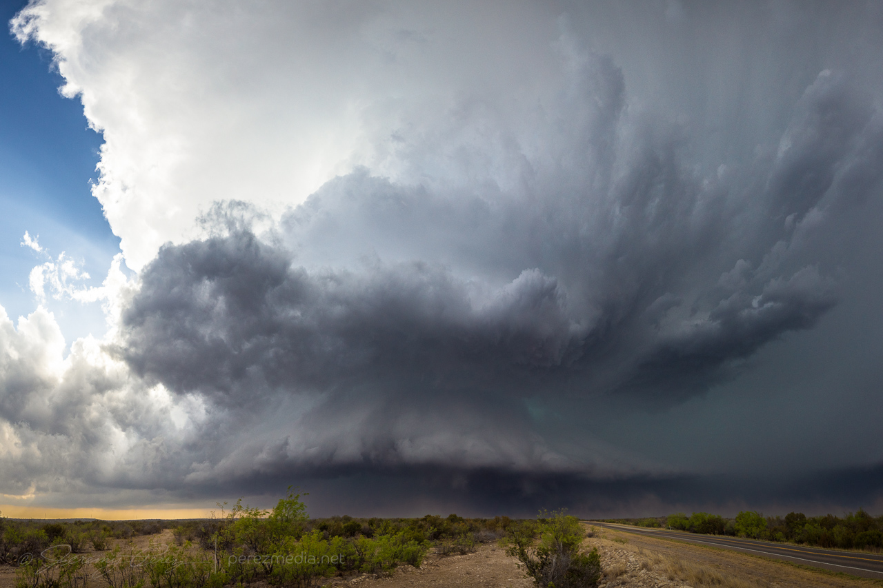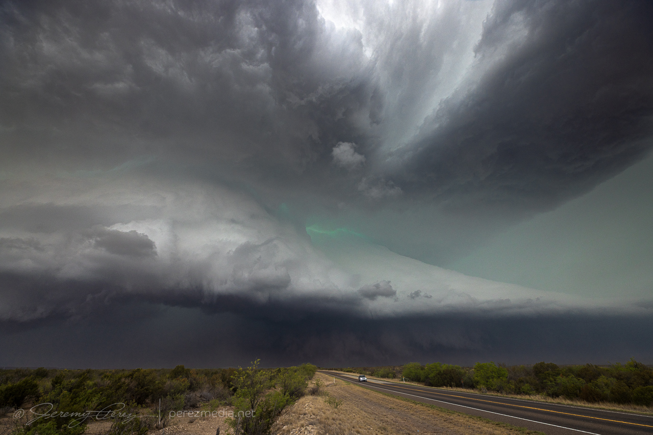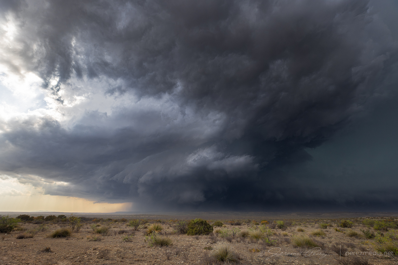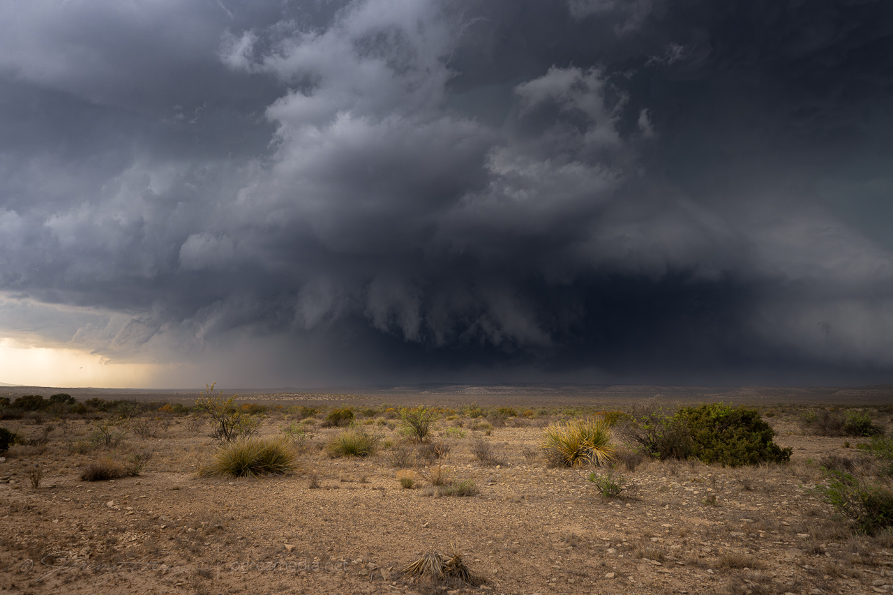 After a half hour of swinging wide, I made it back around to a position in front of the storm of the day as it tracked along Highway 285. By now it was flexing a monstrous new personality with a shaggy maw fed by broad swaths of dust, a curling inflow band and bristled beaver tail deep in the shadows. I don’t need a tornado now. This is a spectacle like no other and it’s eating up the landscape as it heads toward where I’m standing.